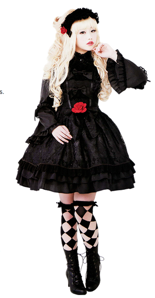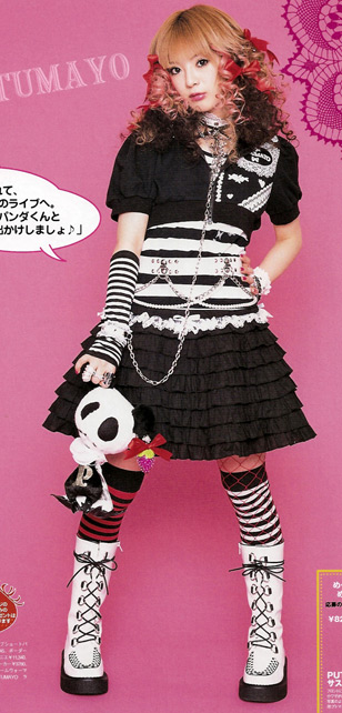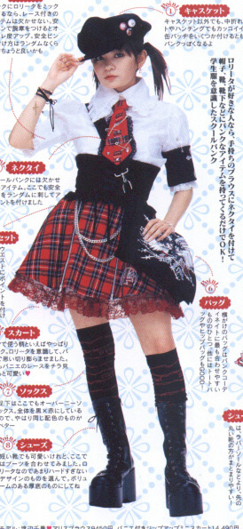 This style adds punk fashion elements to Lolita fashion. Motifs include tattered fabric, safety pins, chains, plaids, etc.