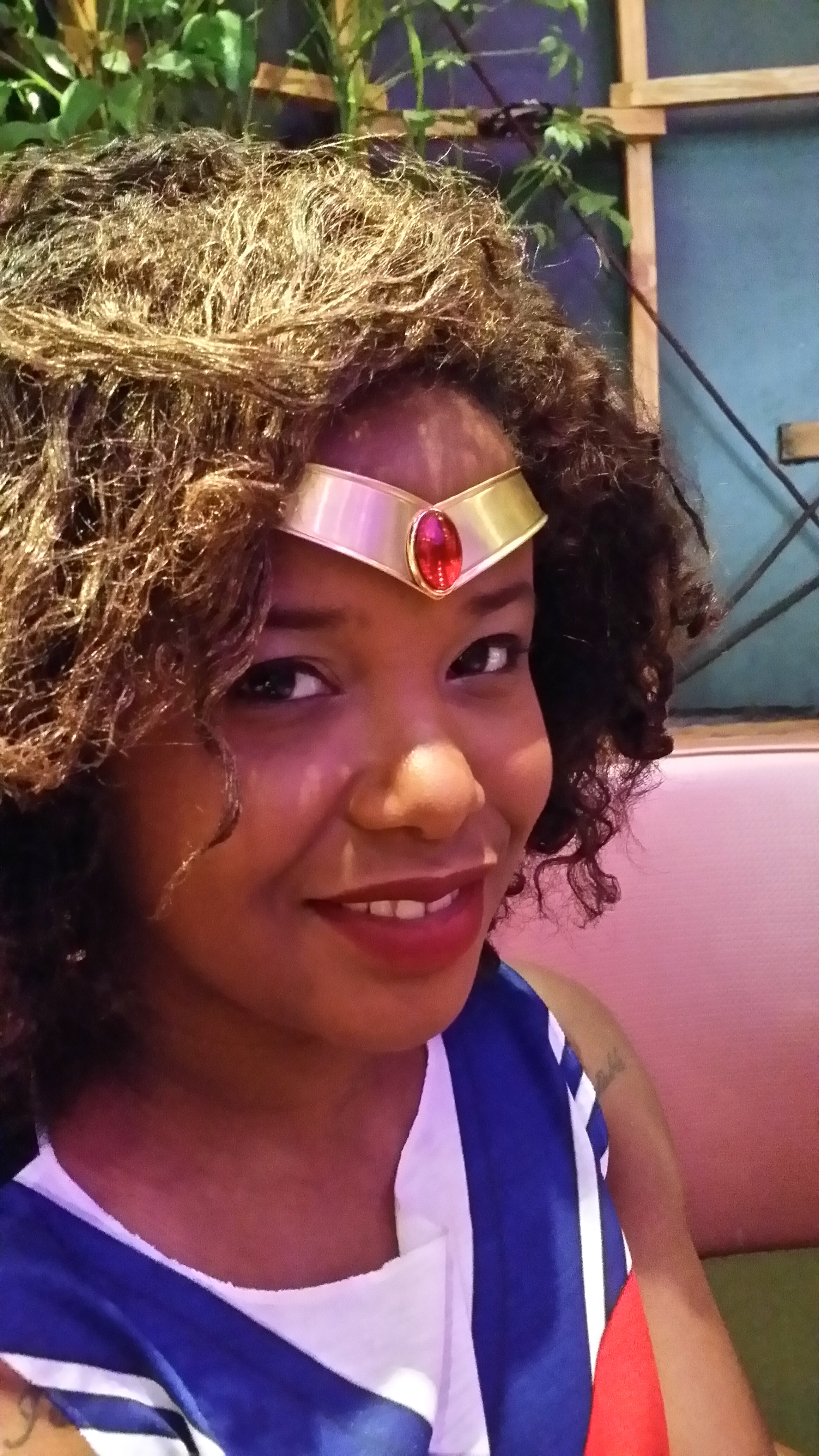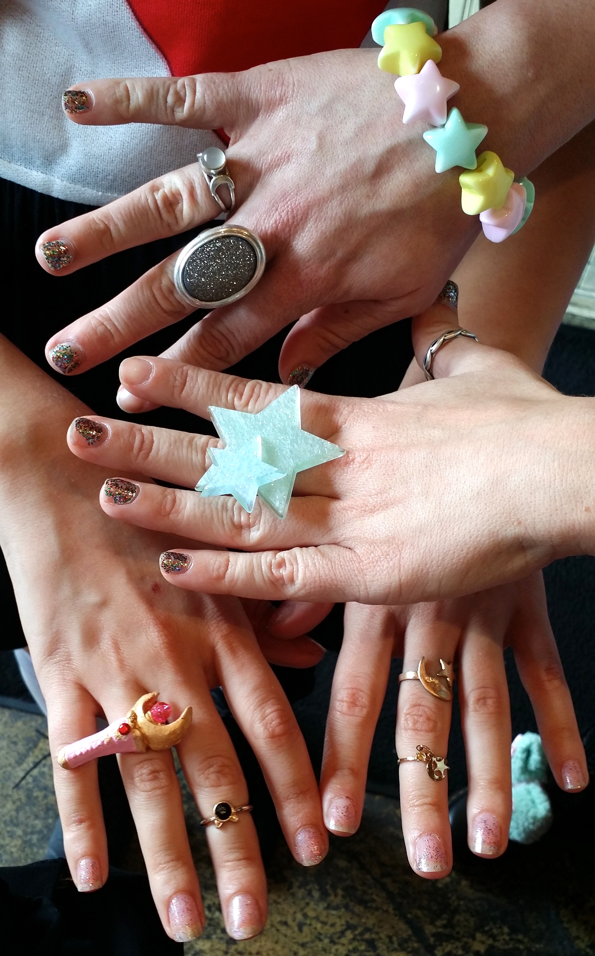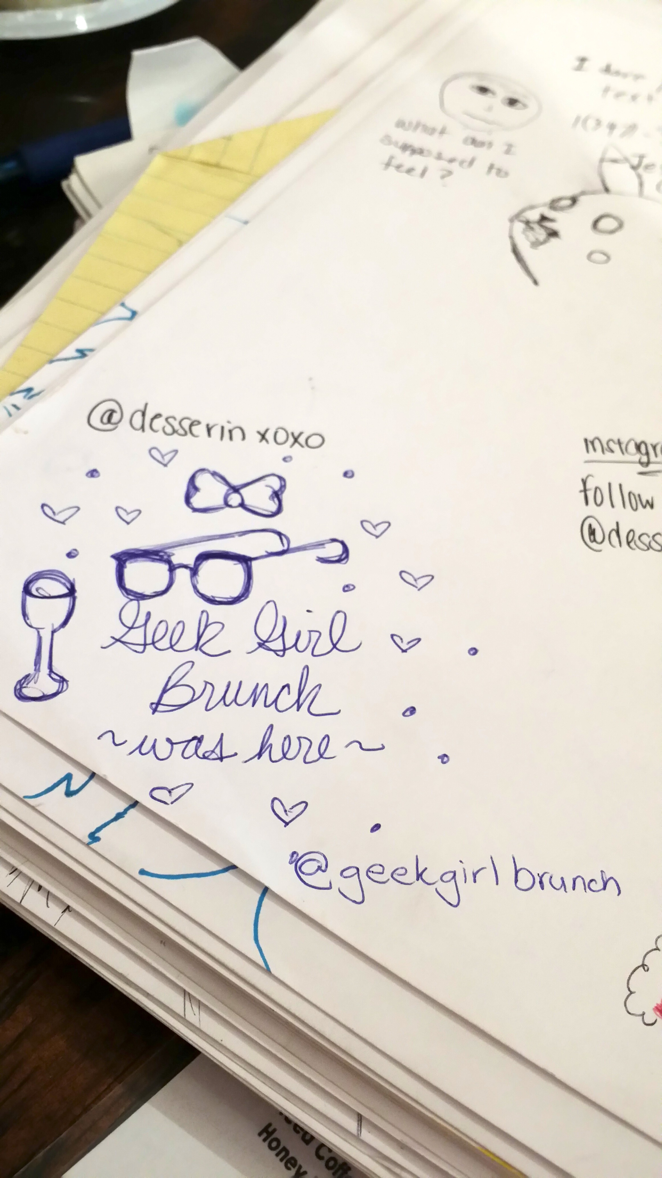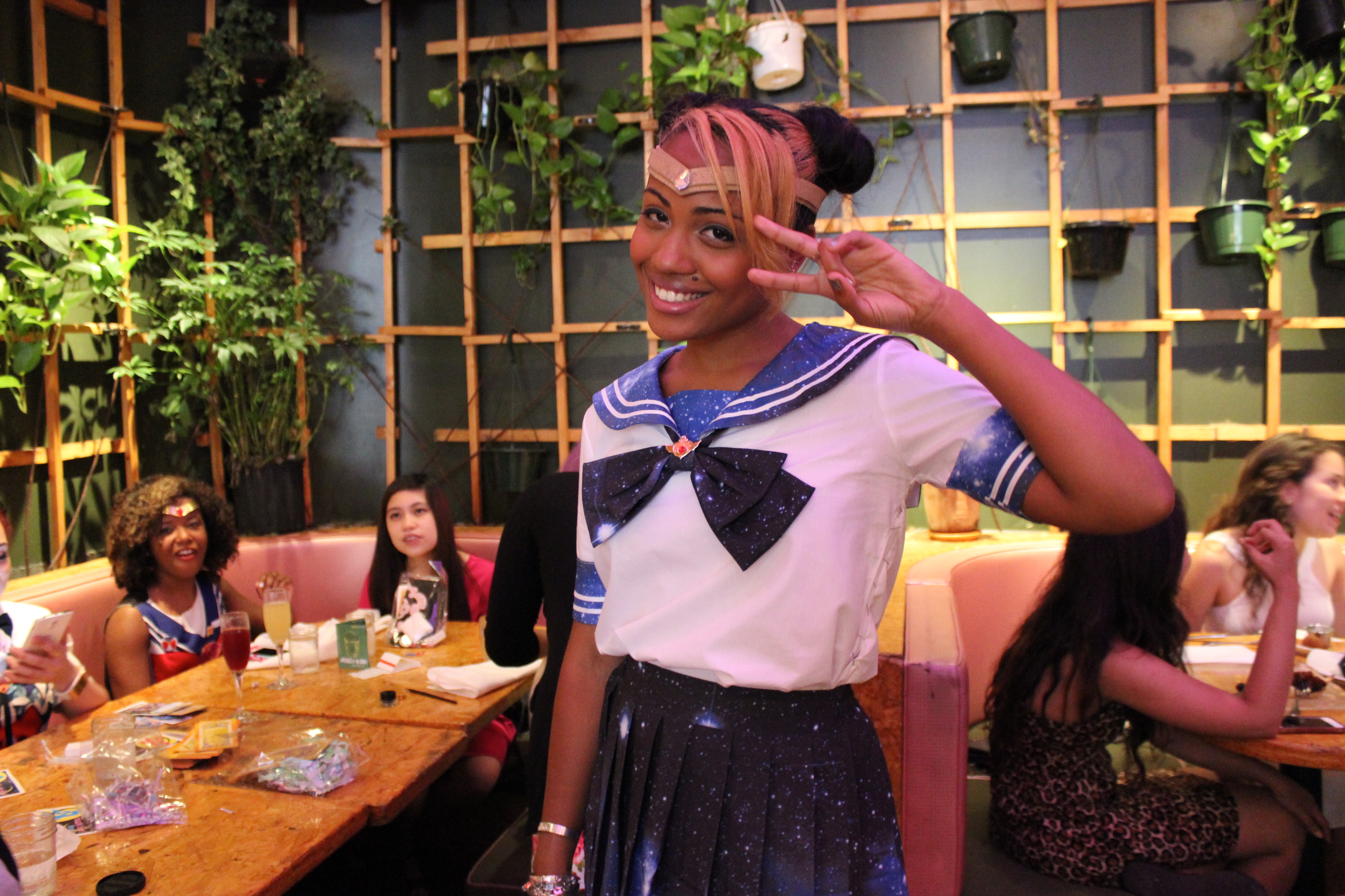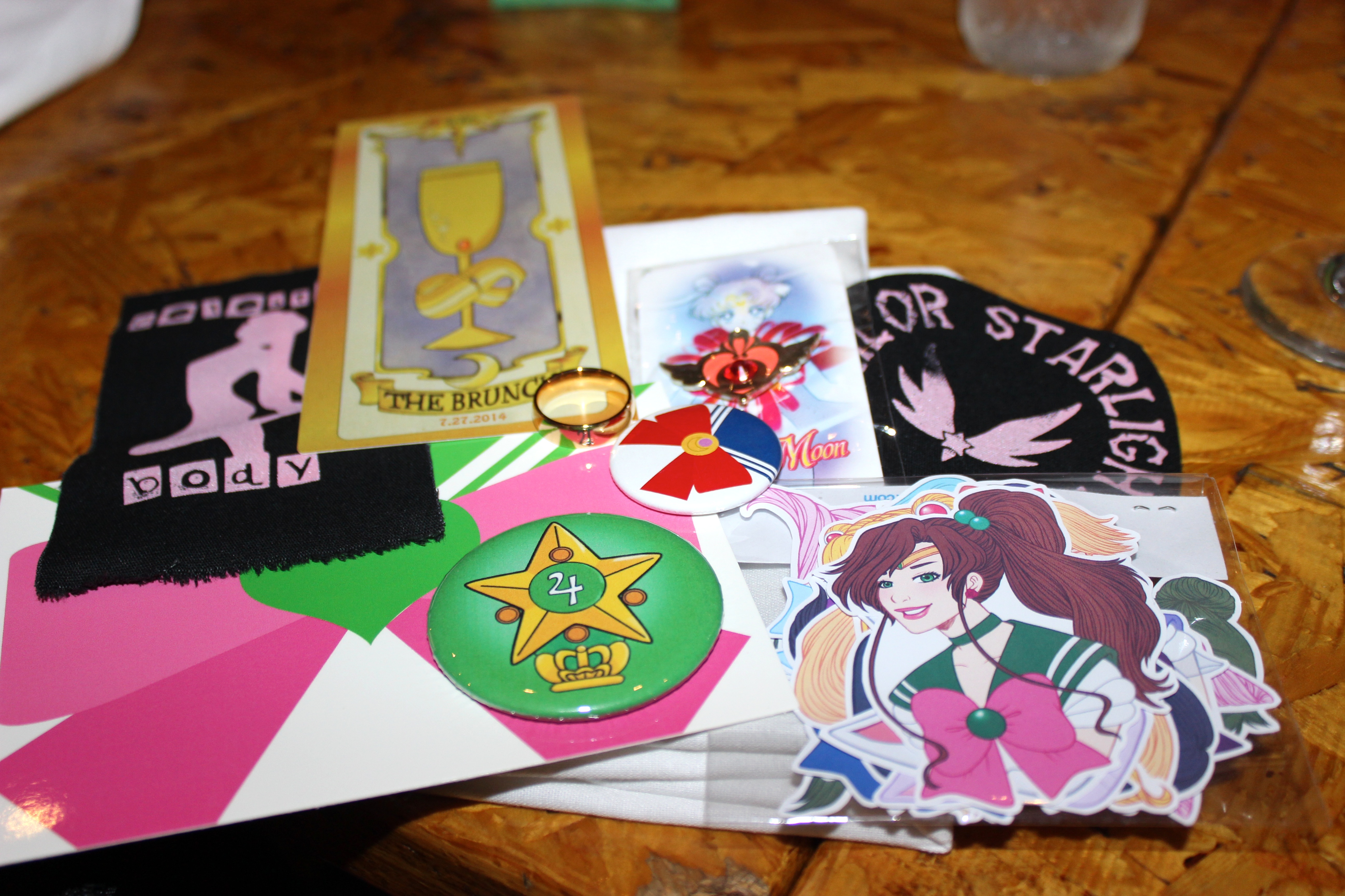 I mean… a LOT of pink. A far cry from the striped Hogwarts house scarves of our last brunch at Macondo, the Magical girls were decked in all manner of kawaii goodness. Bows were bountiful. And brunchettes easily found each other. Jamila wore a full on galaxy print seifuku so she dubbed herself Sailor Gallifrey. While Yissel donned an original outfit that looked to be designed for Cardcaptor Sakura herself, with a print that recalled the artsy color-splashed battle grounds of Madoka. To say nothing of Rachel’s highly covetable “All Negatrash Must Die” shirt and tattoo printed illusion hosiery. And what magical girl gathering would be complete without colored hair? There was red. There was purple. It was green… It was painted gold. And the geek girl accessory game? So on point. Even before the sweet swag. Note: we predict the must have accessory for next month’s brunch will be…. The name tag.