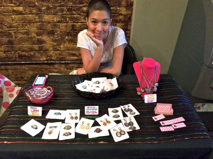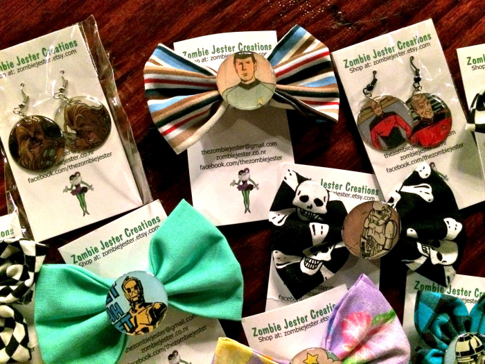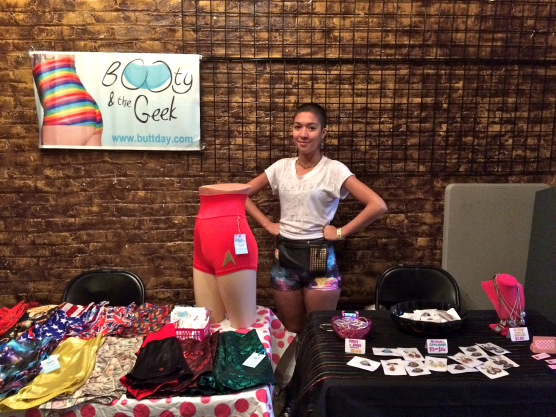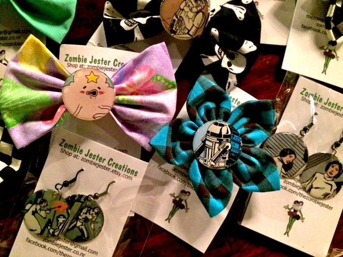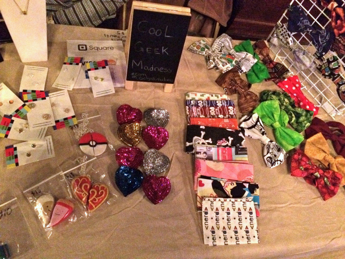 We were also delighted to see some awesome vendors on site. Our brunchette Melissa set up her shop Cool Geek Madness offering geeky jewelry and bow ties for ladies and gents. We all walked away from brunchette Jessica‘s Bat-Errang Jewelry table with punny bracelets. She was also vending for Booty and the Geek; an awesome geek clothing shop owned and operated by the evening’s first performer, Magdalena Fox!