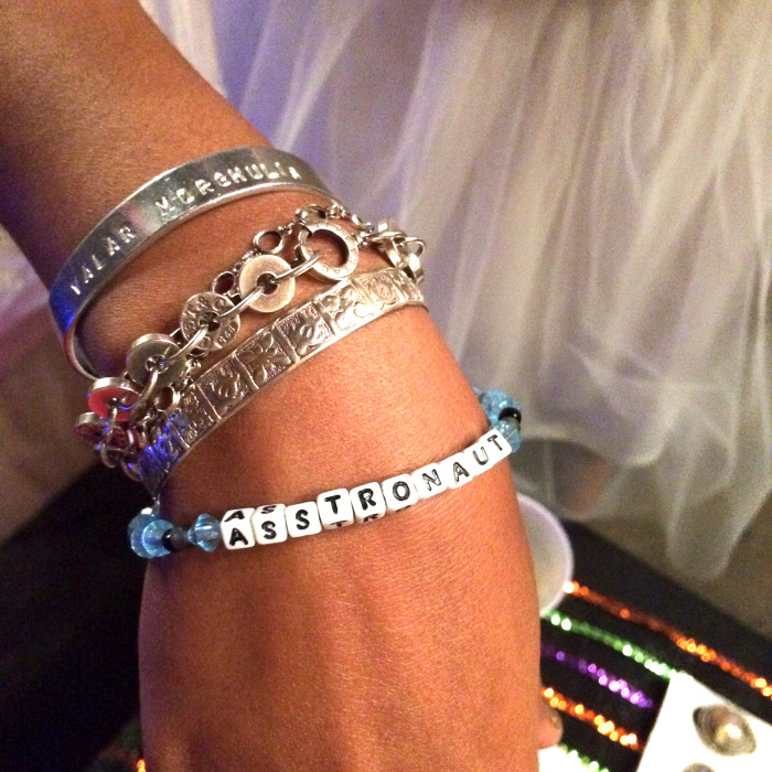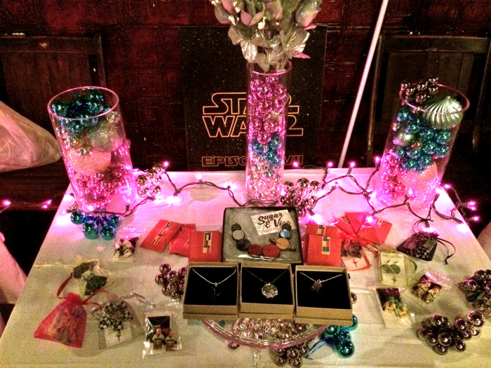 Attendees enjoyed space-themed swag from SV Charms (amazing laser cut planetary necklaces), Boutique Academia (Space-themed jewelry) Zombie Jester Creations (cleverly repurposed comic art jewelry), mermaid says (Lego Star Wars jewelry) WineMakers Sister (TARDIS keychains for Timelords, obviously), and NextLife Toys (super cute Lego-style accessories)! The swag table was a busy place for delighted guests already excited about the tasty treats!