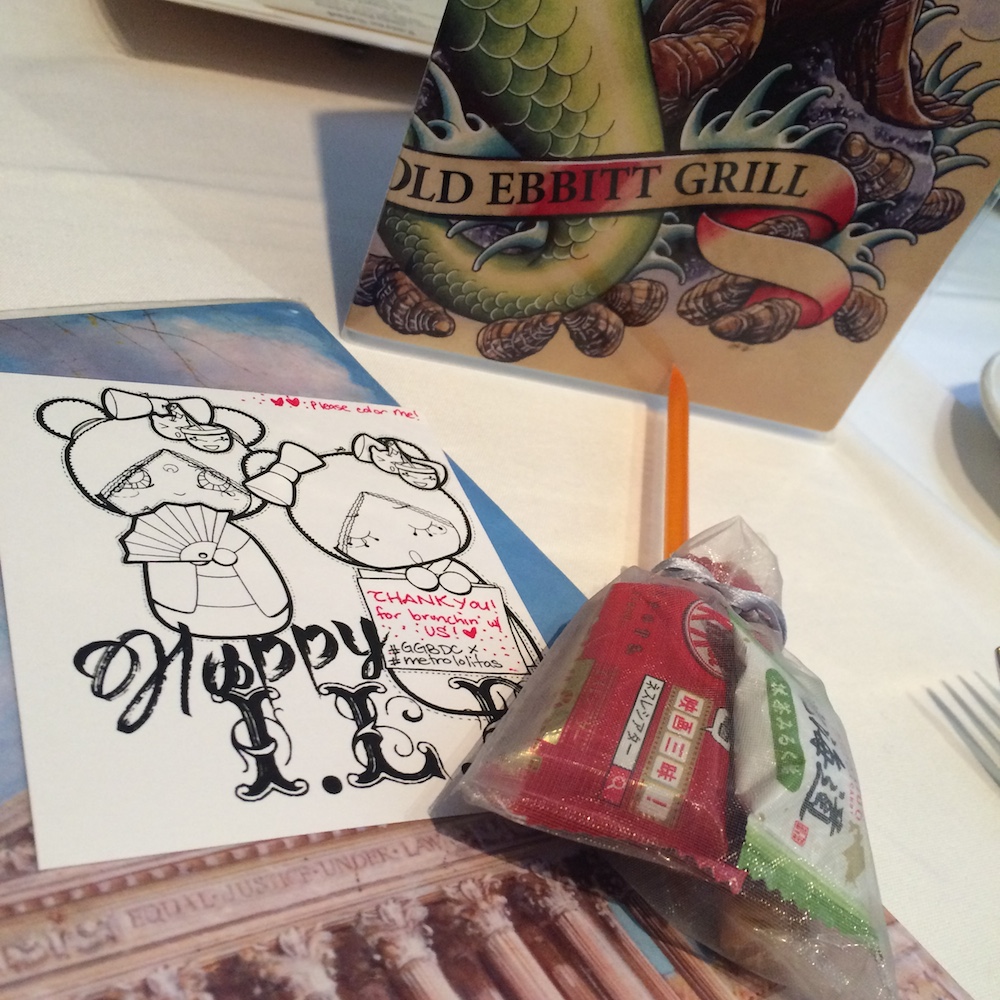 Our gift bags were as sweet as their Lolita counterparts. Our lovely officer, Imani is a queen of all things kawaii, so it made perfect sense for her to design something for this brunch. Each brunchette received a hand drawn thank you that had a small note on how to keep in touch with both GGBDC and Metro Lolitas, respectively. In addition, everyone also receiveda bag of candy from Lolli & Pops with everything from Japanese KitKats to flavored honey sticks.