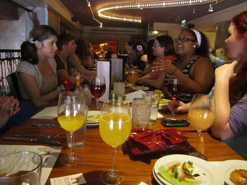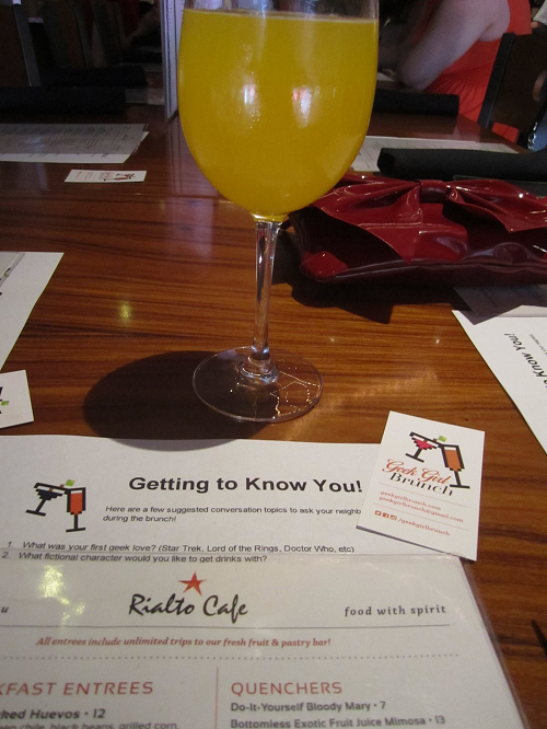We chose Rialto’s, a cafe on the 16th Street Mall in Downtown Denver, which not only had a pastry and fruit bar, but DIY Mimosa and Bloody Mary stations as well! We had so many great closet cosplays of Snow White, Pocahontas, Yzma (from Emperor’s New Groove), the Red Queen, Belle, and more. After a round of icebreakers including questions like “Which Weasley would you date?”, “What would your fictional mode of transport be?” and “Where is Waldo, really?”, everyone settled into a delicious brunch.