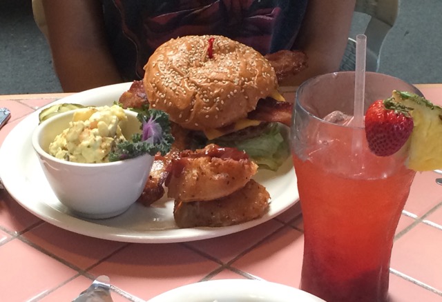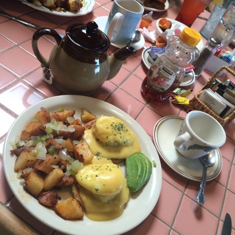 It had large palms and plants, exotic animal murals, paired with a quaint styled décor, reminded me of how European explorers maybe dined while on African safari long ago. (It should be noted that my limited understanding of the safari golden age stems from movies, etc. and is likely completely false.) The place was great and offered everything from hotcakes, crepes, chorizo dishes, and several styles of my personal favorite, eggs benedict.