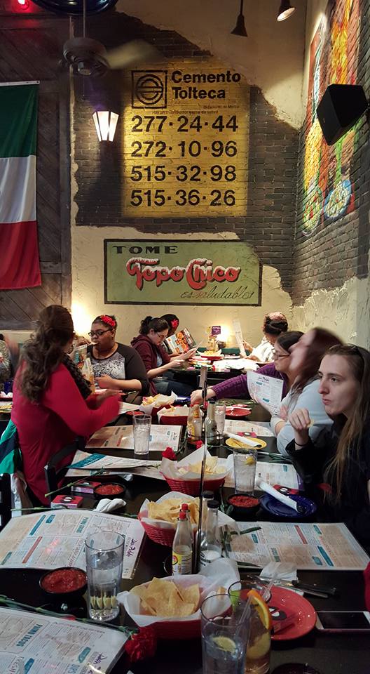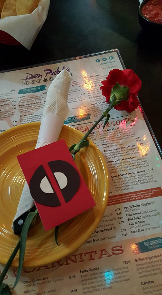 Even though it was freezing here in Baltimore, around 15 lovely ladies made it out for the Deadpool themed lunch! We had an amazing waitress at Don Pablo’s who was fantastic. I can imagine it’s not easy with such a large group but she did an outstanding job of checking on everyone and making sure we all had the right orders. Before the ladies descended upon the restaurant we placed a red carnation and a box of candy hearts that our officer Sara decorated at every seat, a nice little welcome for when everyone arrived. Arrive they did! One by one, they slowly started filling in and it didn’t take long for the conversation to start flowing. Of course there was talk of Deadpool but ladies could be overheard talking about their updated Hogwarts sorting, what they’ve been watching on TV and Netflix, and how we’re all ready for winter to be over! In complete Deadpool fashion, some of us ordered chimichangas, others stuck with tacos, and a few even left room for dessert! Before we parted ways before the movie though (we had some time to kill), we held a raffle for a swag bag filled with wonderful goodies like a sketch by Michael Duron and a cute hair clip by Nerd Girl Britt and a few other Deadpool goodies. A huge thank you to them for donating! We truly appreciate it.