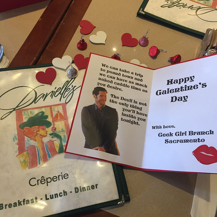 In February, the Sacramento Chapter decided to hold a post-Valentine’s Day brunch giving brunchettes an opportunity to receive a special Valentine from their fictional fandom crush. In RSVPing to brunch, attendees were asked to provide who the name of their fandom crush. Answers varied from Rhett Butler to Lucifer Moringstar to Malcolm Reynolds and more. Â The Sacramento Officers (and one of our regular brunchettes) got together and crafted Valentines specific to each ladies crush.