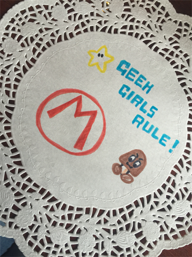 We spent a good portion of our time discussing themes and ideas for future events. Now that spring weather is FINALLY arriving in Wisconsin, we’re looking forward to doing a little tailgating at a Brewers game – perhaps for Superhero Night? – and working a few other field trips in as well. Last time we had a kraft paper tablecloth to decorate as we chatted and ate, this time each place was set with a doily that our geek girls could color – or spill – on as they saw fit. Our officers used their doilies for lists so that we don’t forget any of the great ideas we came up with!
