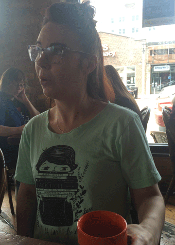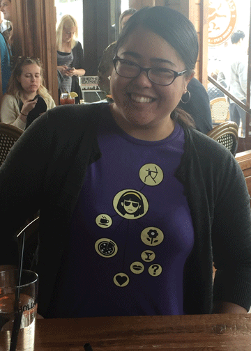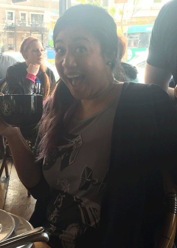 We started out with brunch, at the site of our launch brunch, Cafe Hollander. Even though it was Mother’s Day weekend, and the Susan G. Komen race was that morning, they were very accommodating of our small but mighty group of five. Our geek girls showed up in their best comic-based gear to enjoy fancy pancakes and bison eggs benedict and fill up on caffeine before a long day of comic shopping.