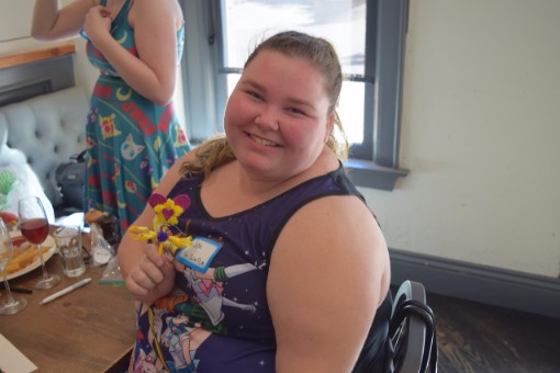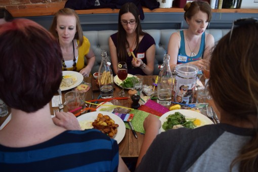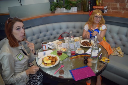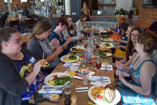 We chose local restaurant “The Kitchen” for this brunch and they were very accommodating with our large group and even offered to make us special “pink” mimosas, which we called, “Moon Prism Power!” And several of our brunchettes dressed for the occasion! So many excellent t-shirts, outfits and a bonus…Elizabeth as Sailor Venus!