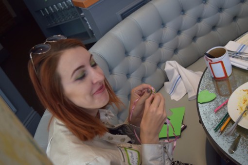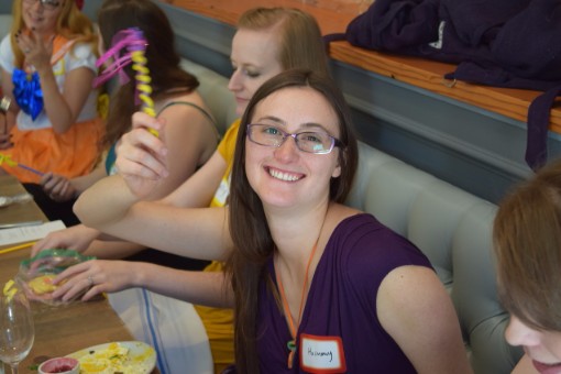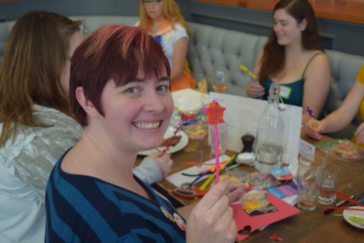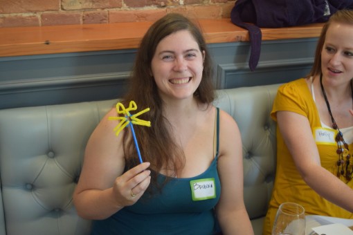 Following our mad lib, we passed out craft supplies and had each brunchette create a wand to match their Sailor Scout from the mad lib. Some of the ladies got very invested in their crafting and created actual masterpieces. We then put all the wands into a bag and drew a winner at random. Elizabeth won a Sailor Moon pendant (from local store Laser Moon), a bath bomb from Fizzy Fairy Apothecary and a car charm!