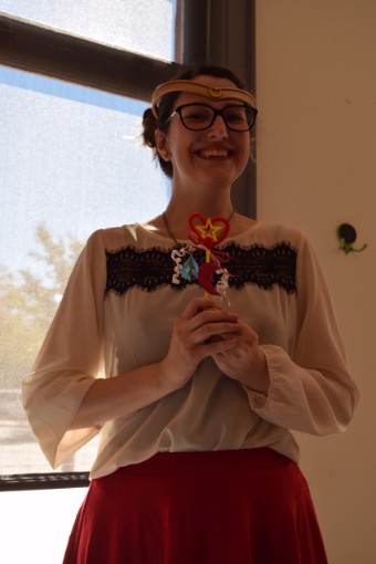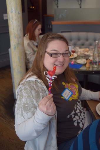 We required much more participation for our activities at this brunch. Our first activity was a mad lib. We challenged each brunchette to make up her own Sailor Scout and create a battle cry by filling in the blanks on our mad-lib cards. We awarded a prize for the funniest mad lib: “Sailor Fiesta Gorda” by Harmony! (Runner up went to Nicole’s “Sailor Tatooine”.) Harmony won some extra Sailor Moon buttons and a pair of Sailor Moon boot covers.