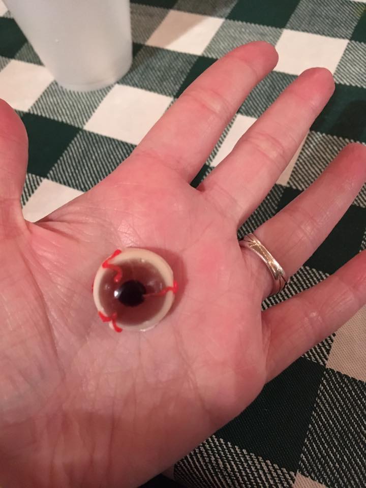 We met up inside the Farm Kitchen Cafe to hand out goodie bags to our members. Each bag contained Halloween-themed candy, glow sticks, pencils, erasers, shot glasses, and a pet ghost in a jar. Member Susan brought us some candy eyeballs. Not as squishy as you’d think.