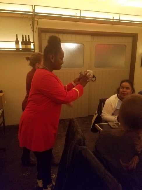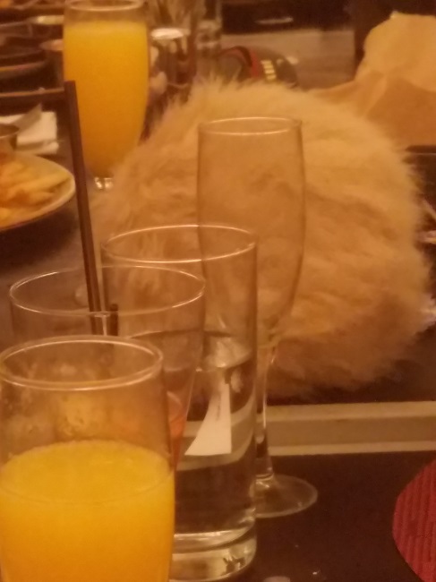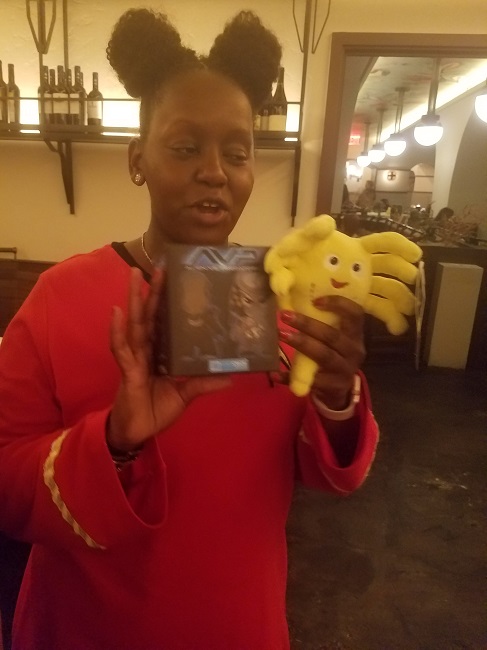 Tribble centerpieces purred as brunchettes munched on chips and guacamole. Everyone wore their finest Doctor Who, Star Wars and Star Trek ensembles, and a space cats dress with cat collar from Miss Patina became a brunch star. Conversation progressed from naming our favorite space fandoms to inspiring real-life women astronauts to Rogue One and episode VIII speculation.