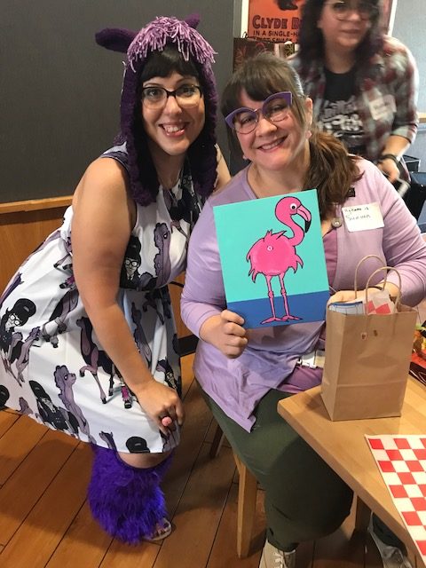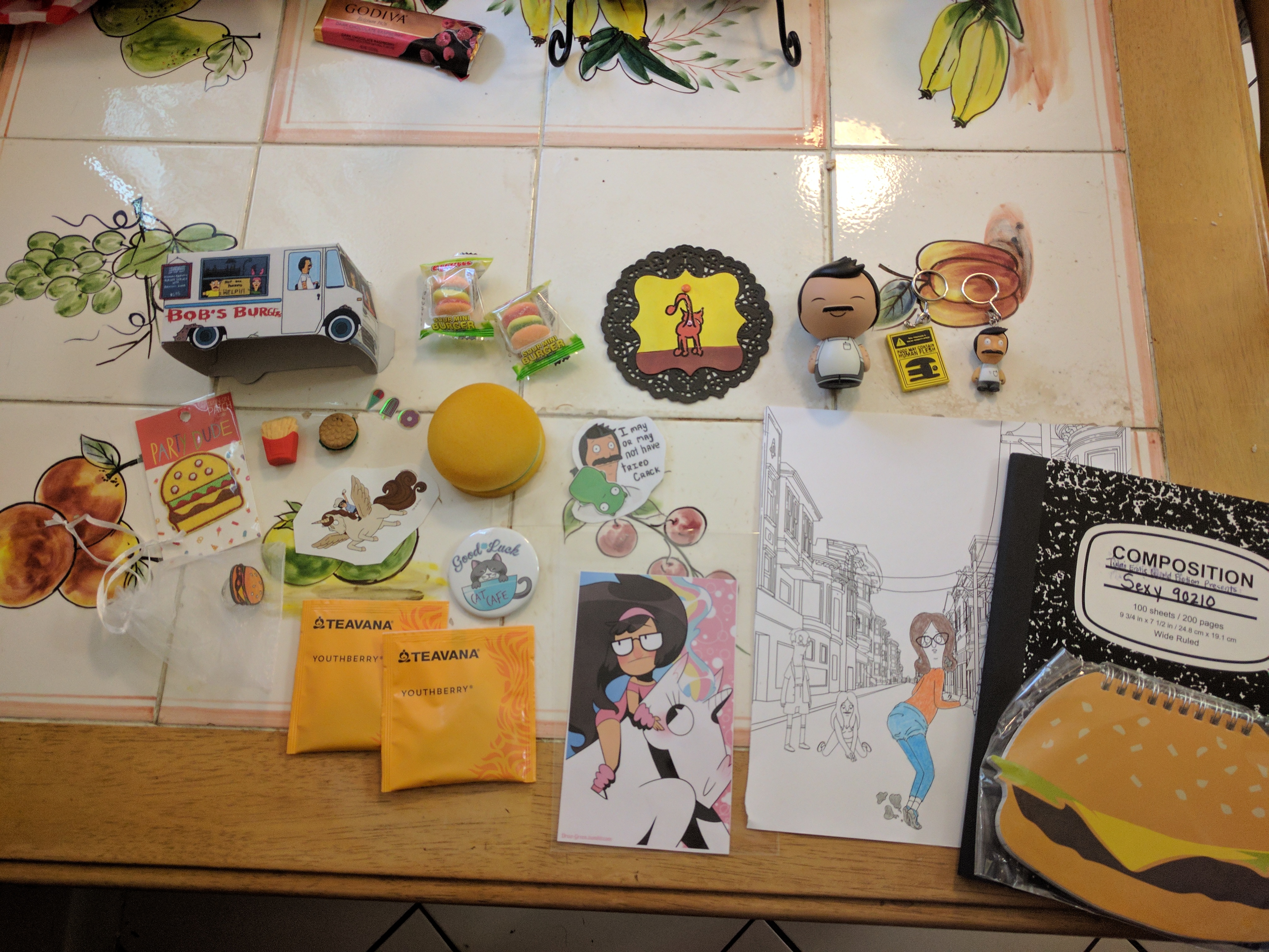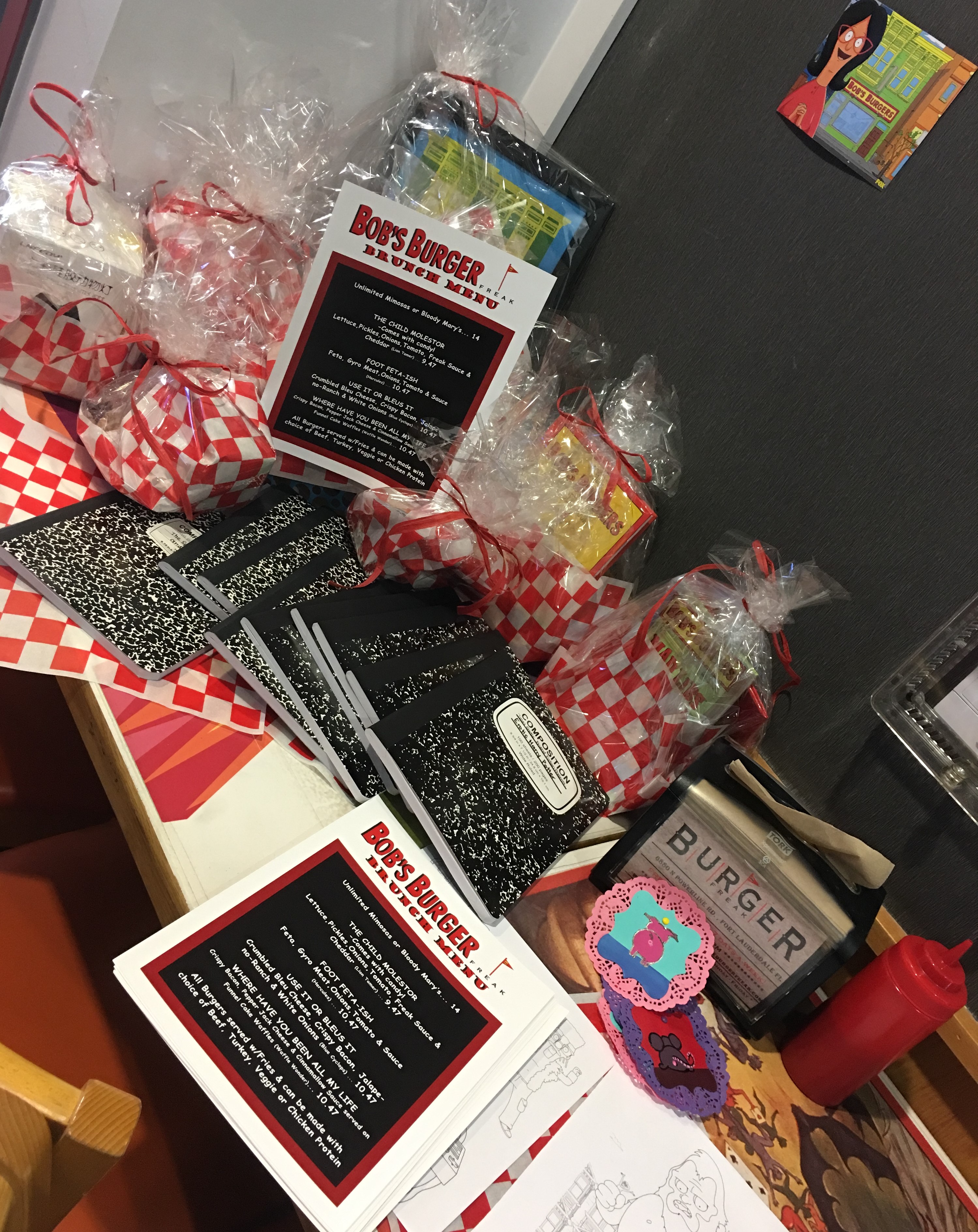 Our raffles were out of this world! Each prize went out with a custom Tina’s Erotic Friend Fiction composition notebook. Items included character gift sets – Funkos, Dorbz, keychains, and blind box items; the Bob’s Burgers Official Cookbook; Bob’s Burgers MadLibs; and a restaurant storefront print by Majestic Posters (Etsy shop link).