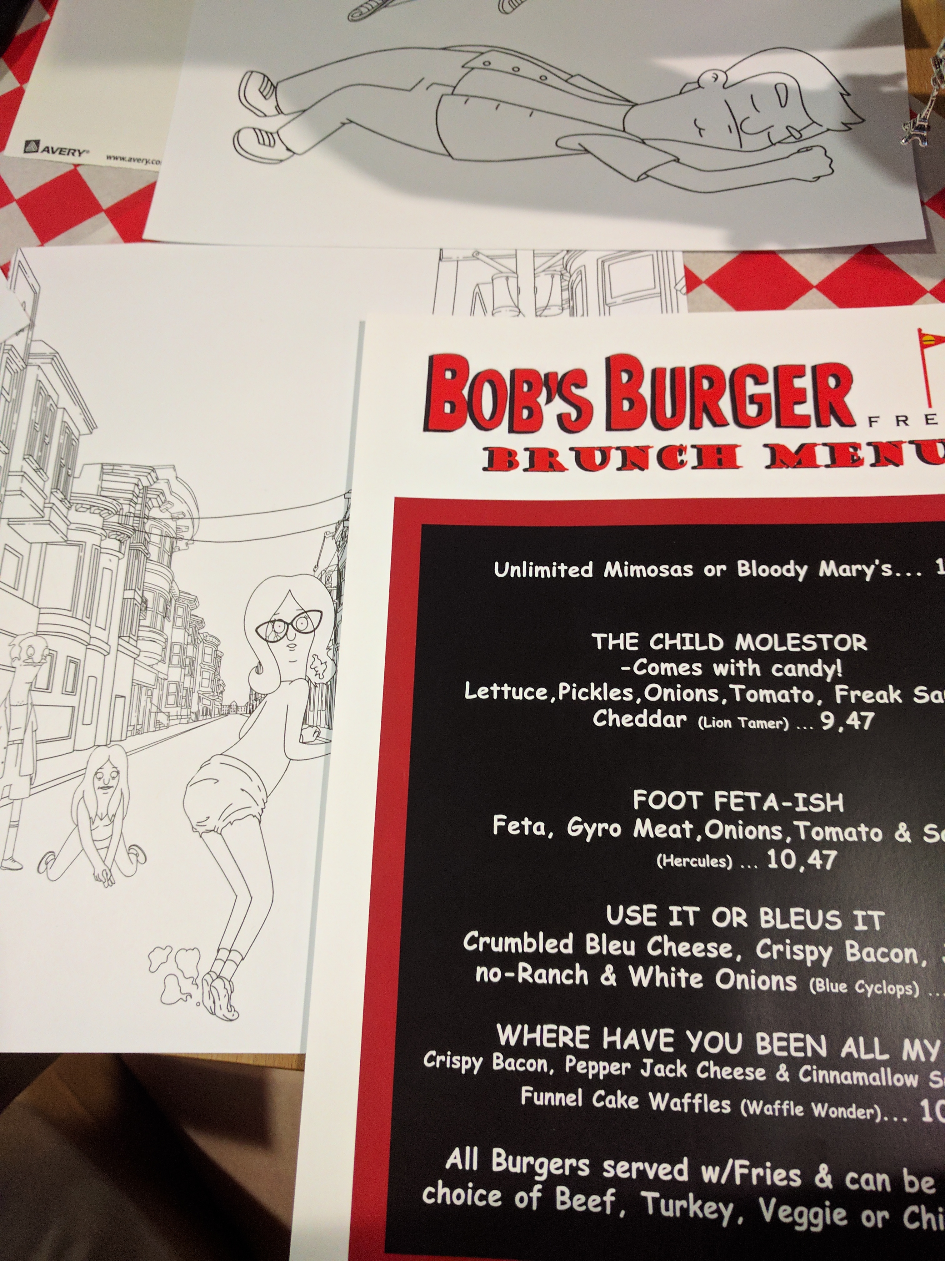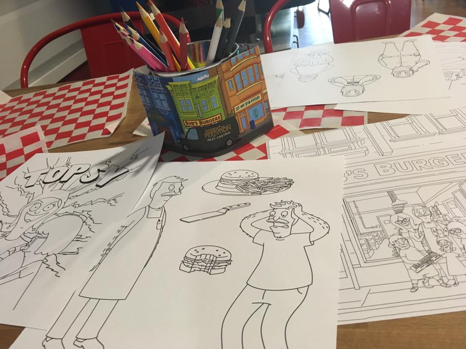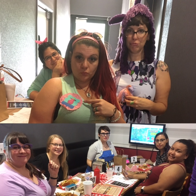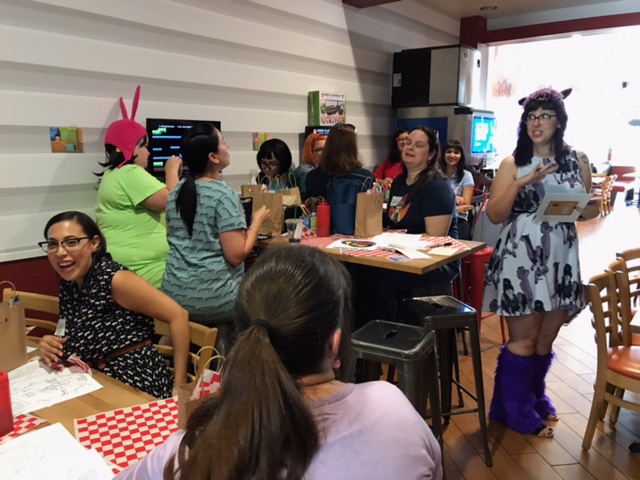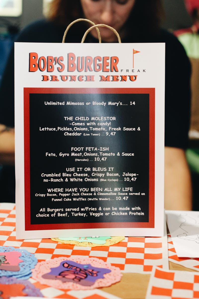 We spent months putting together our burger-themed swag bags and were rewarded with squeals of delight when our brunchettes dug in. Items included character stickers from Happy Otter Art (Etsy shop link), a Drew Green Buttloose Tina print (artist Tumblr link), exclusive GGB-FTL burger rings, burger sour gummies, Teavana teas, burger notepads, burger pins and patches, Bob’s foodtruck foldables, and Aunt Gayle’s “Art Walk” animal butt gifts by one of our own brunchettes, Summer. Every table was covered with coloring pages from the Bob’s Burgers Coloring Book and attendees colored while they waited for their food. Additionally goodies were spotted from 7 Deadly Pins (Store Envy link) and Catstacher (Etsy store link). – Special shout-out to Nabi, blogger at One Tiny Dinosaur (check out her Facebook and Insta) for some gorgeous pics of our brunch… and for her amazing BUTTS glasses.