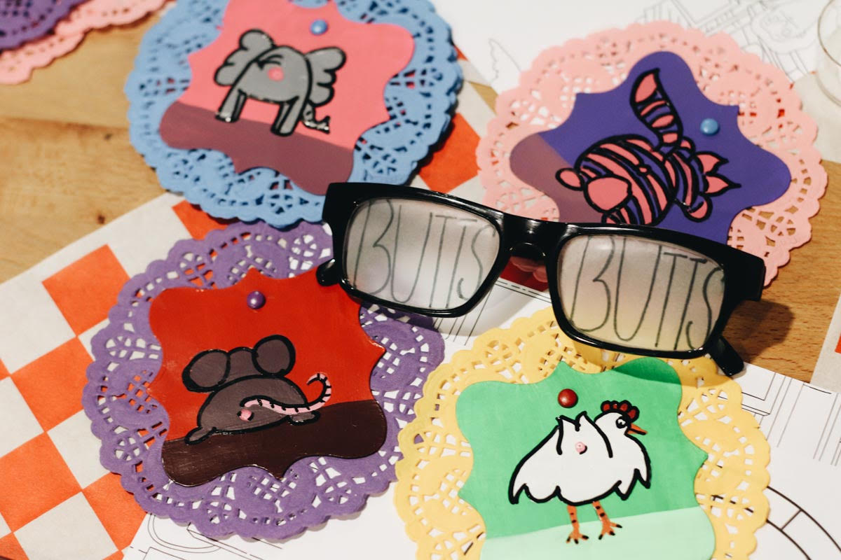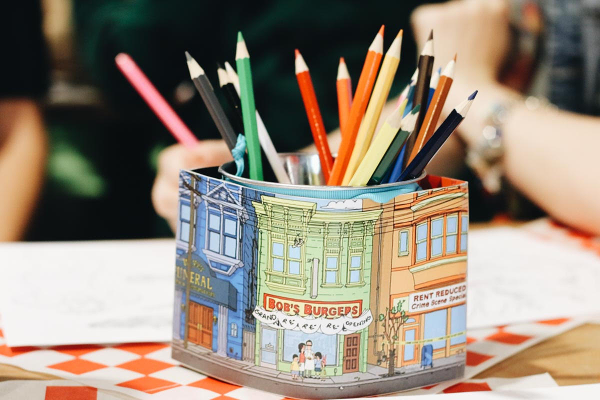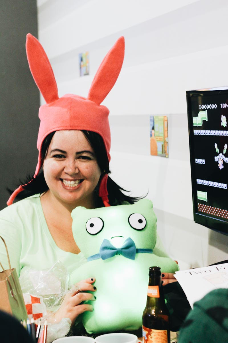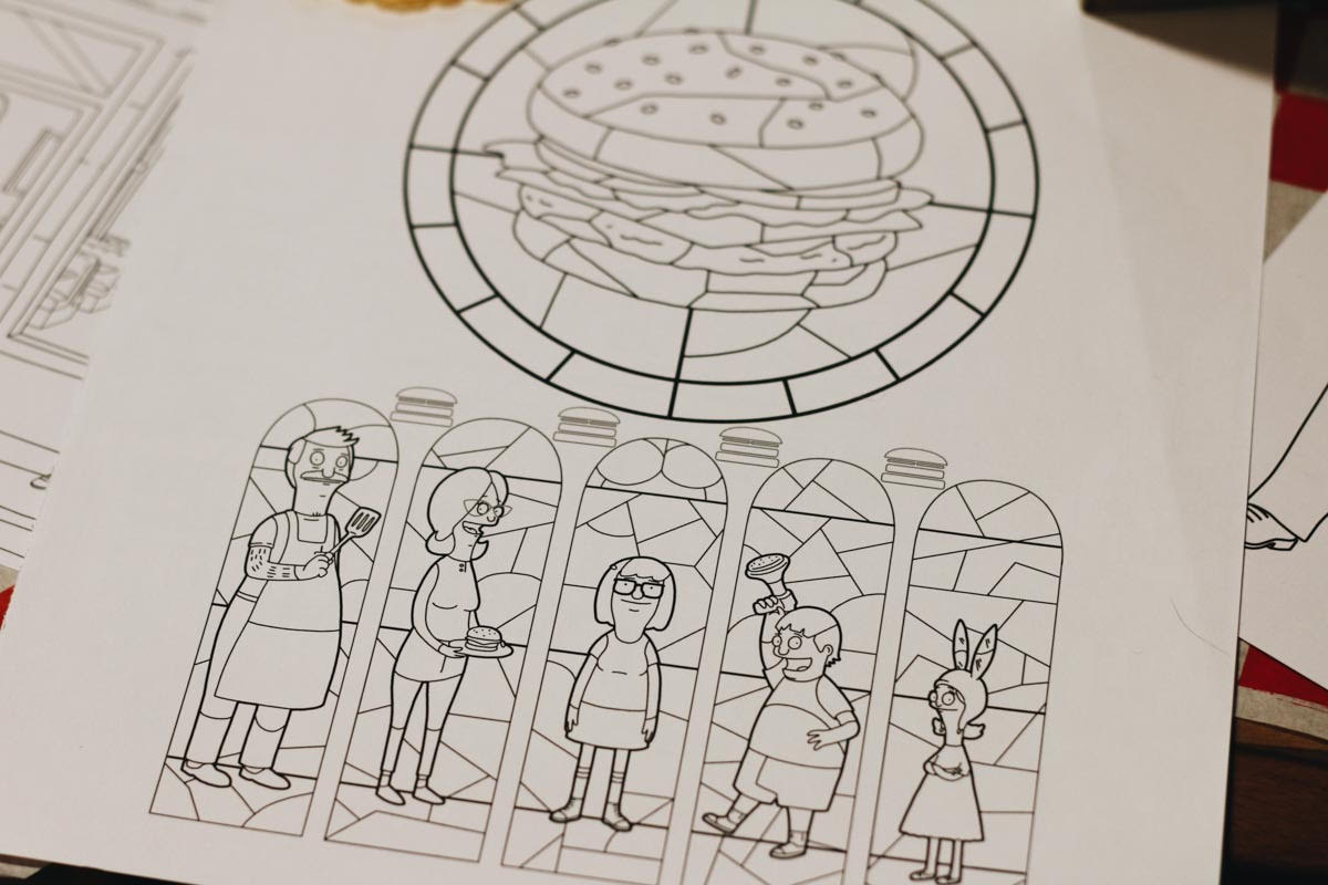 We spent months putting together our burger-themed swag bags and were rewarded with squeals of delight when our brunchettes dug in. Items included character stickers from Happy Otter Art (Etsy shop link), a Drew Green Buttloose Tina print (artist Tumblr link), exclusive GGB-FTL burger rings, burger sour gummies, Teavana teas, burger notepads, burger pins and patches, Bob’s foodtruck foldables, and Aunt Gayle’s “Art Walk” animal butt gifts by one of our own brunchettes, Summer. Every table was covered with coloring pages from the Bob’s Burgers Coloring Book and attendees colored while they waited for their food. Additionally goodies were spotted from 7 Deadly Pins (Store Envy link) and Catstacher (Etsy store link). – Special shout-out to Nabi, blogger at One Tiny Dinosaur (check out her Facebook and Insta) for some gorgeous pics of our brunch… and for her amazing BUTTS glasses.