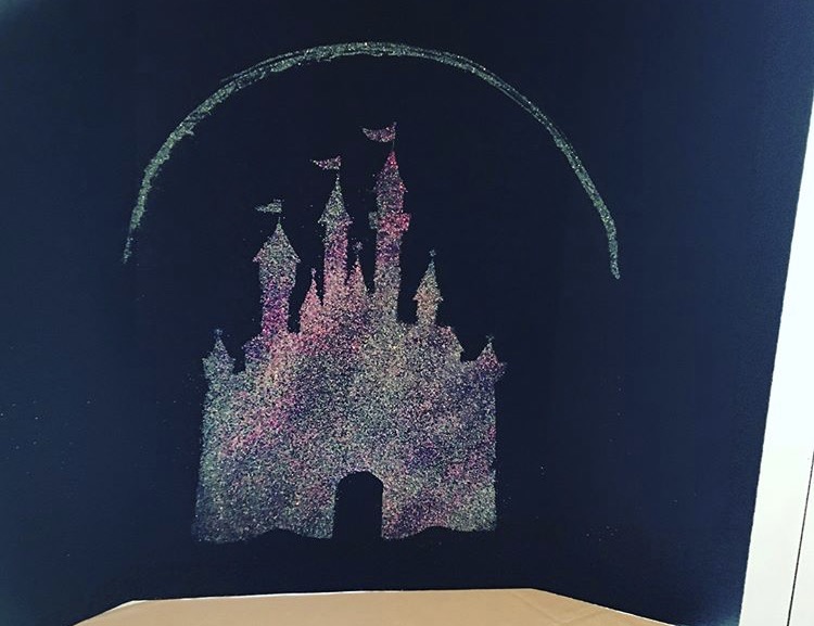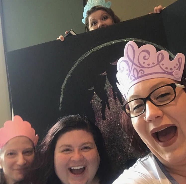 Our brunchettes – and even our servers – wore princess crowns on their heads as we had the brunch. It was great to see some faces for the first time! Sam created our very glittery Disney castle photo backdrop that was very popular with the girls.