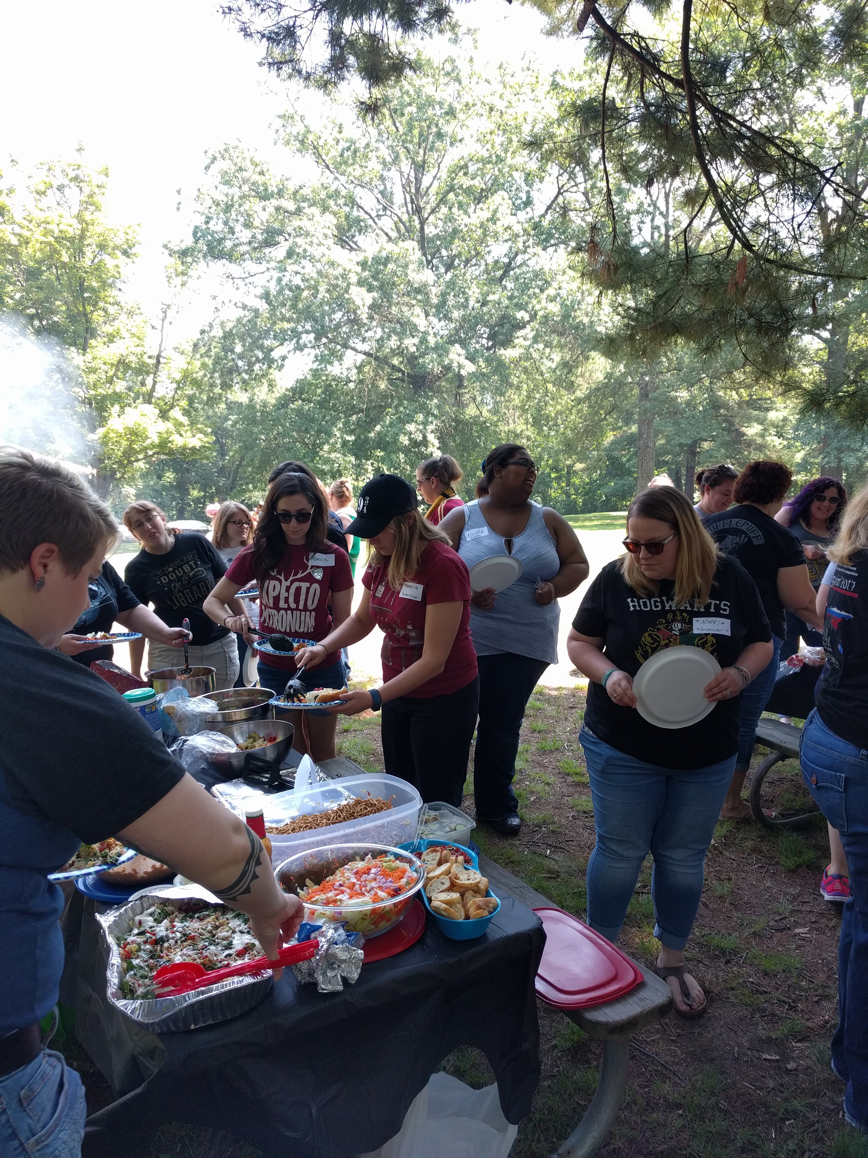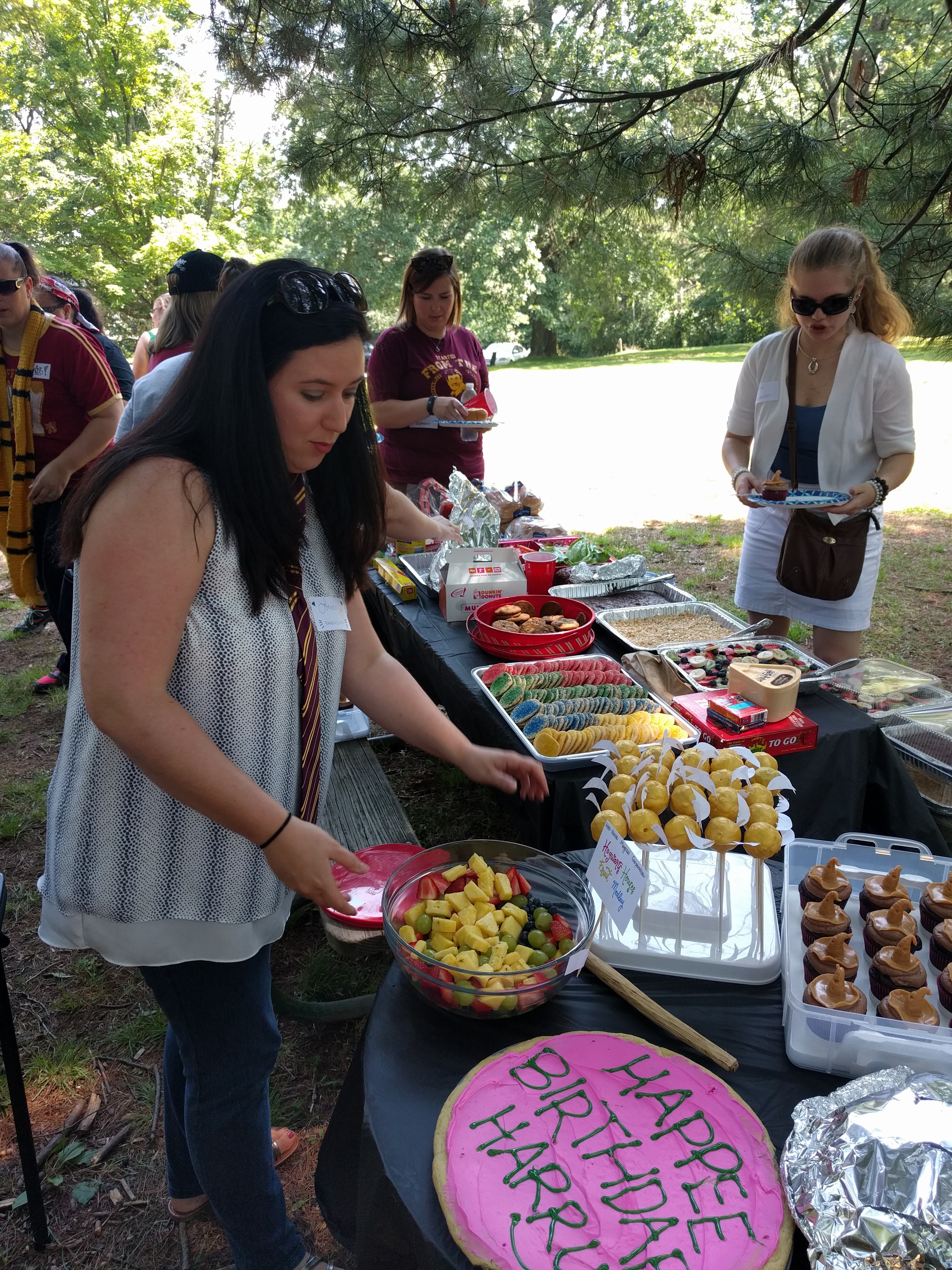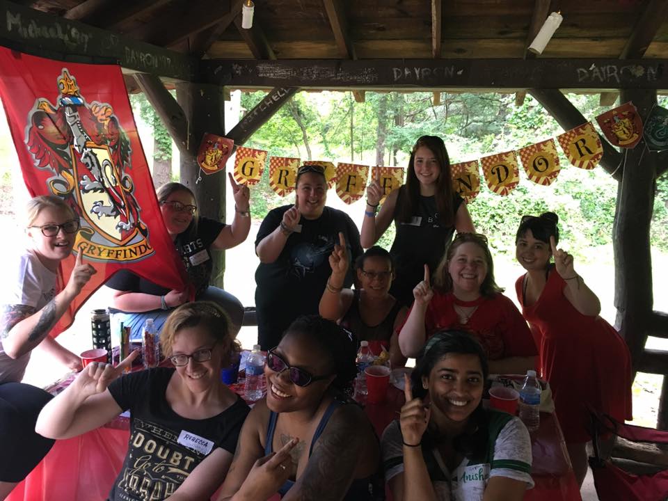 Give-aways included t-shirts, coloring books, handmade throw pillows sewn and donated by one of our amazingly talented Brunchettes, mystery bags full of goodies, and more! The potluck style picnic brought out everyone’s amazing cooking skills. We feasted on everything from Mexican street corn to German potato salad, Golden Snitch cake-pops and Sorting Hat cupcakes. It was truly amazing!