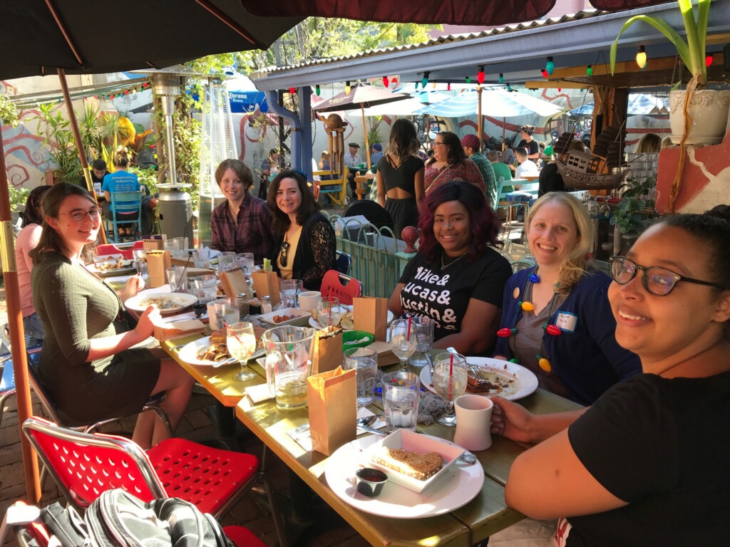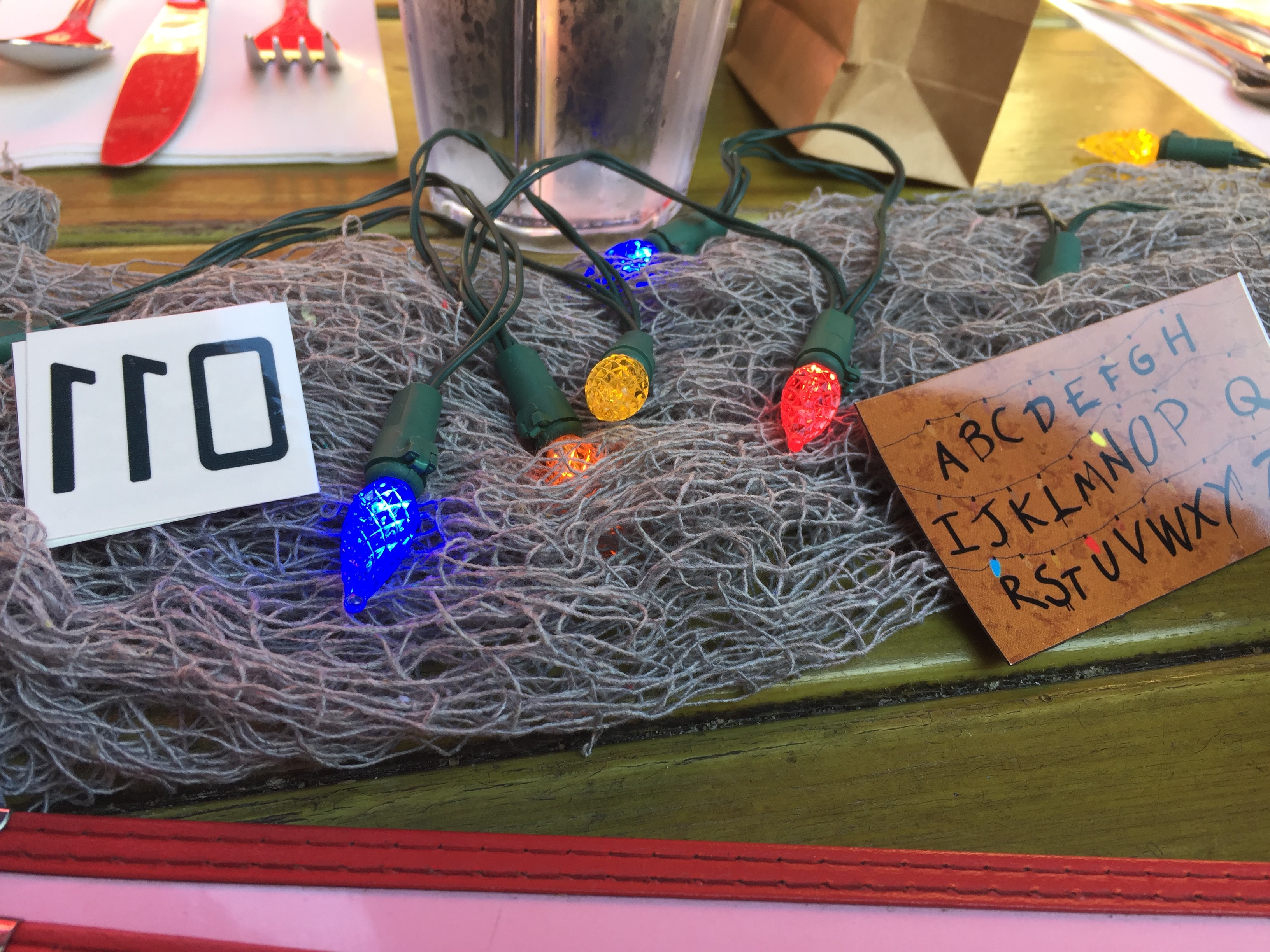 Our venue was Silk City, a renovated diner in the heart of the Northern Liberties neighbourhood of Philadelphia. The wonderful late summer weather allowed us to dine comfortably in the outdoor beer garden, at a picnic style table. We decorated our table with battery operated Christmas tree lights, just like those used by Joyce to communicate with Will, in the first season of the show, and a gray mesh table runner. Our menu included brunch favourites such as, chicken and waffles, shrimp and grits, and Belgian waffles, but there were also unique takes on standard brunch choices, such as the creme brûlée french toast, and pancakes with candied bacon cooked inside. We washed all this great food down with coffee, and of course brunch cocktails, including bloody Mary’s, sangria, and mimosas.