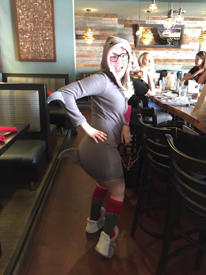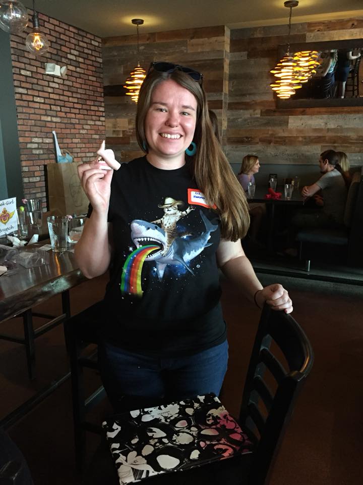 For our 16th brunch, GGB Fort Collins celebrated all things sharks! Shark Week, JAWS, Sharknado, sharks with friggin laser beams attached to their heads… you get the idea. We convened at Smokin’ Fins for some delicious seafood – so we could feel like super fancy sharks! And our server, as seen in the photo below, fell madly in love with officer Jakki (note the side glance in her direction). But sadly, his love did not manifest itself in free food.