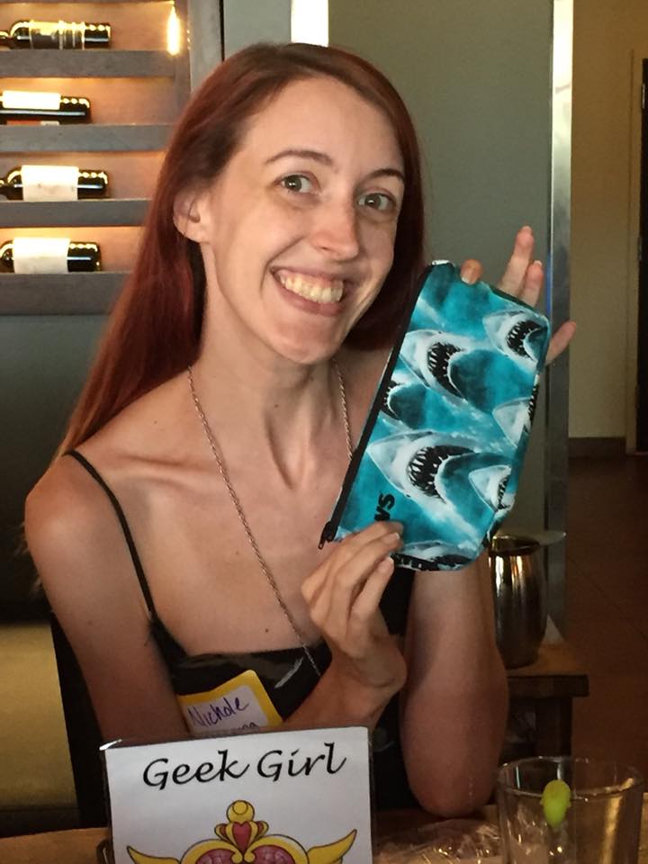 Finally we chose our raffle winners! Officer Sarah won the shark necklace created for us once again by the lovely SuperNova Designs. Nichole won a JAWS makeup bag and Liz won some shark salt and pepper shakers (donated by Nichole)!