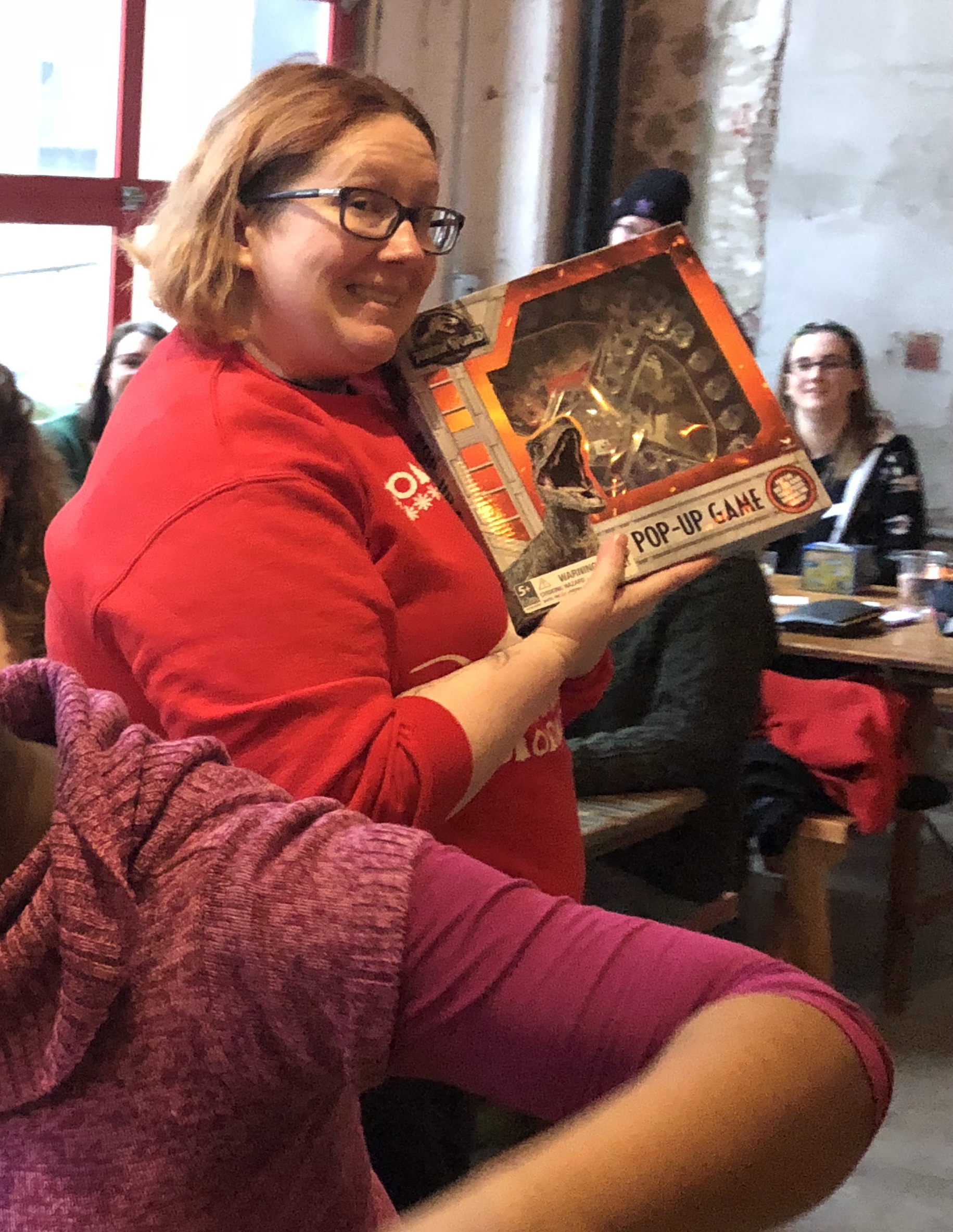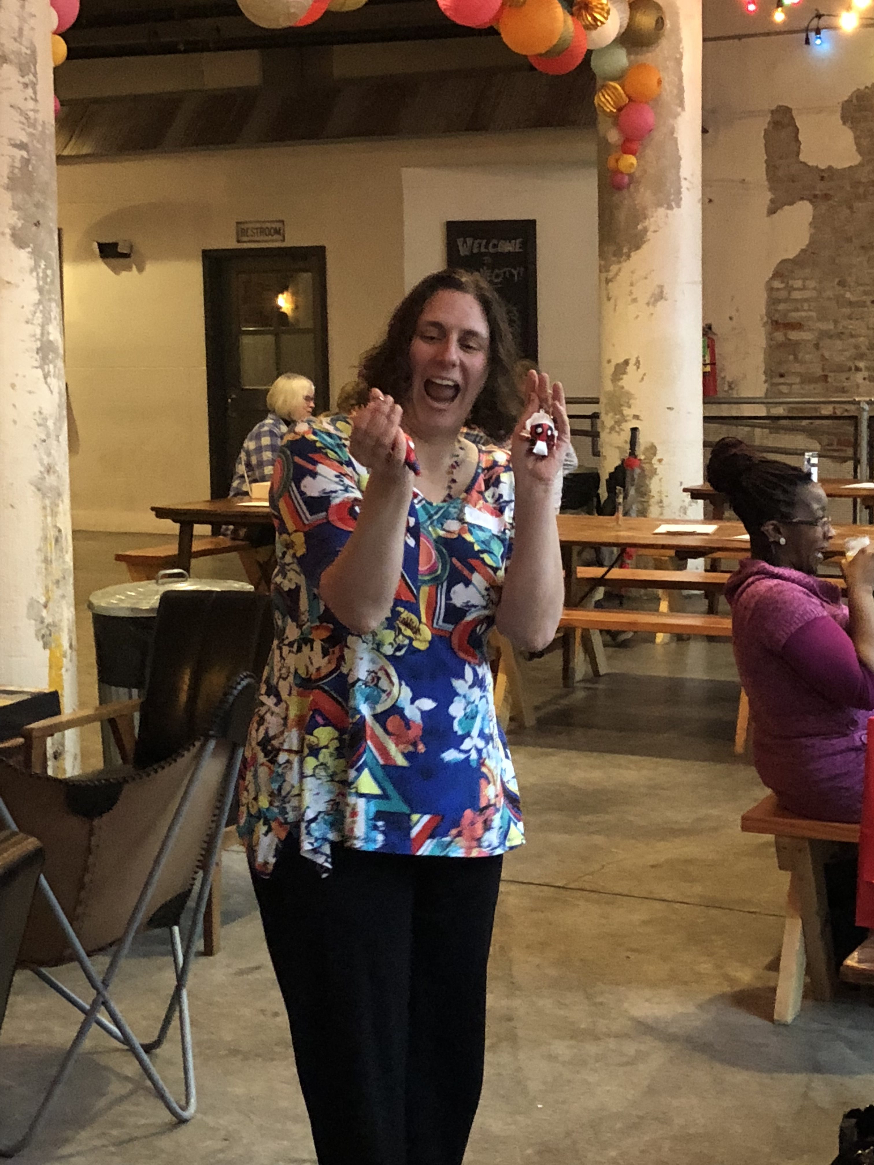 Brunchettes who chose to participate in our Geeky Gift Exchange brought wrapped items from a fandom they love (under $10). The wrapped gifts were set out for members to look at and try to guess what might be inside. When it was time to start, the member with the closest birthday was the first to pick from the pile. Kim’s birthday had just passed, so she started the game off by choosing a present to unwrap. The next Brunchette to choose was the person who brought the gift she opened. They either stole an open gift or unwrapped a new gift! The game continued until all participants had a chance to either steal or open a gift and all gifts were opened.